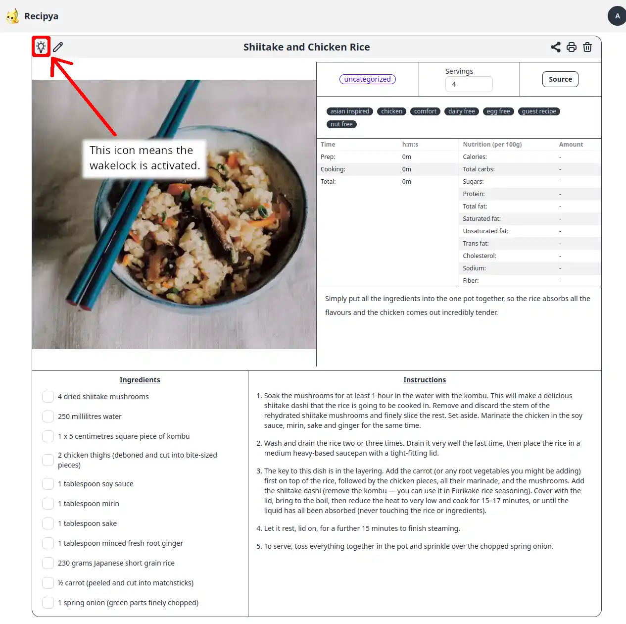 On supported browsers, you will notice a light bulb icon to the far left of a recipe’s title. When the light bulb is on, the wakelock is enabled and the screen will not sleep.