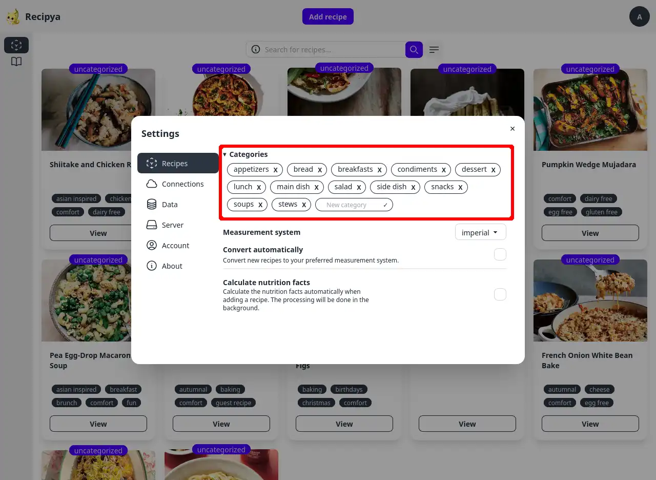 Vous pouvez gérer vos catégories depuis l’option Catégories dans l’onglet Recettes des paramètres.