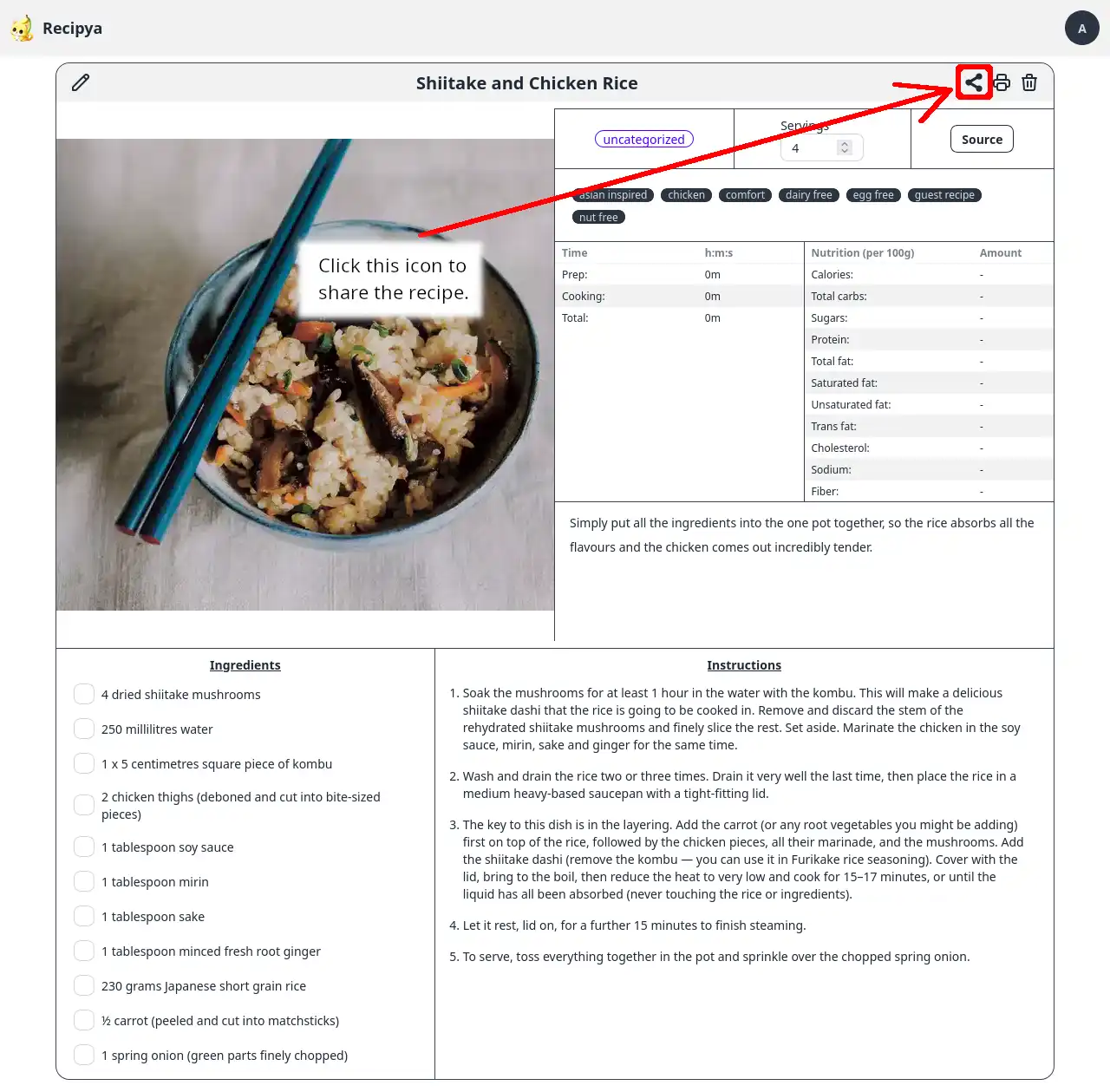 Pour générer le lien, vous devez d’abord afficher une recette. Ensuite, cliquez sur l’icône de partage à droite du titre de la recette.