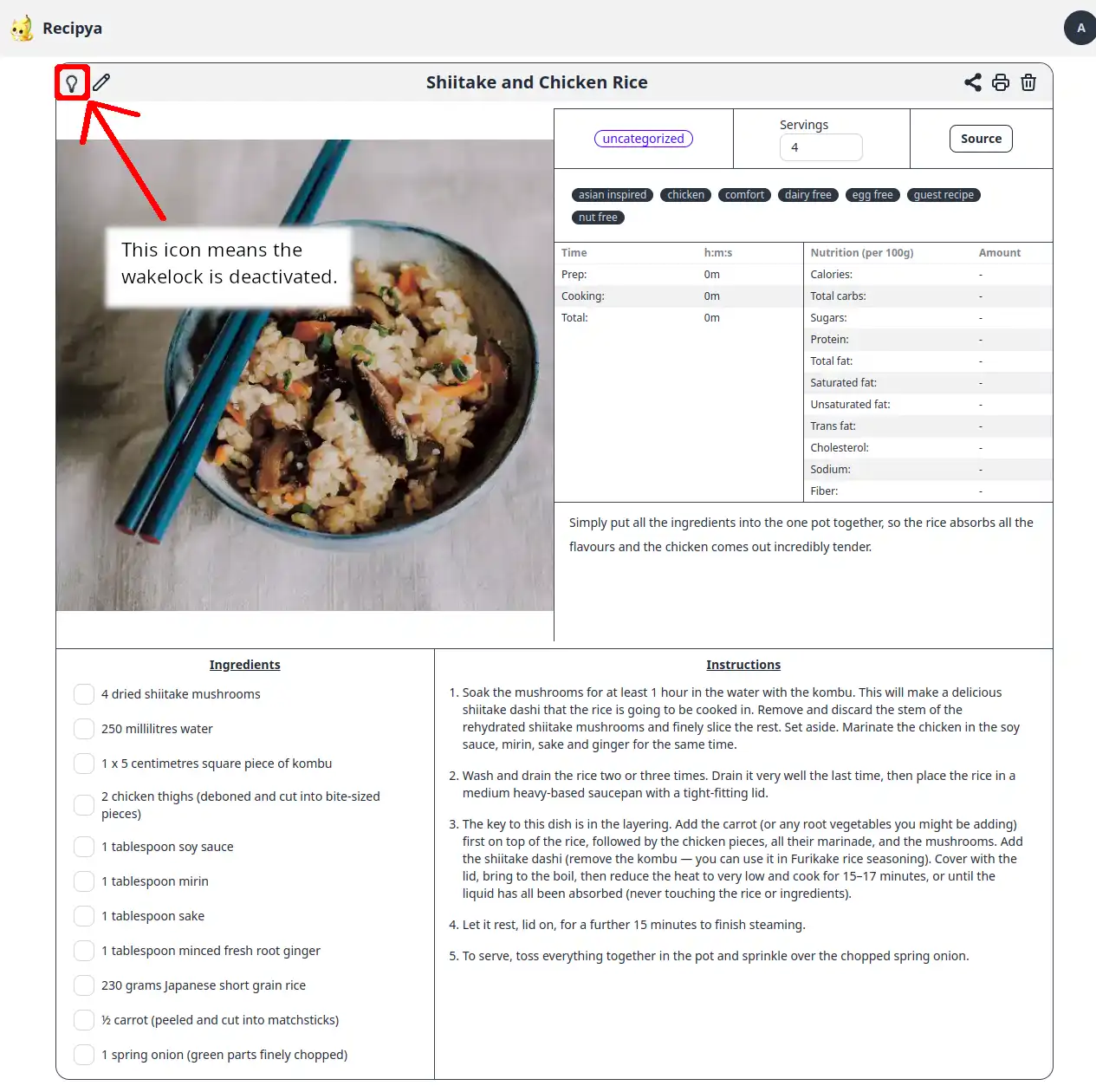 Recipya résout ce problème en fournissant un wakelock du navigateur lors de la visualisation d’une recette, empêchant ainsi l’appareil de se mettre en veille.